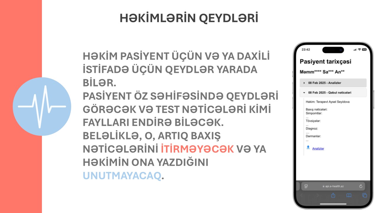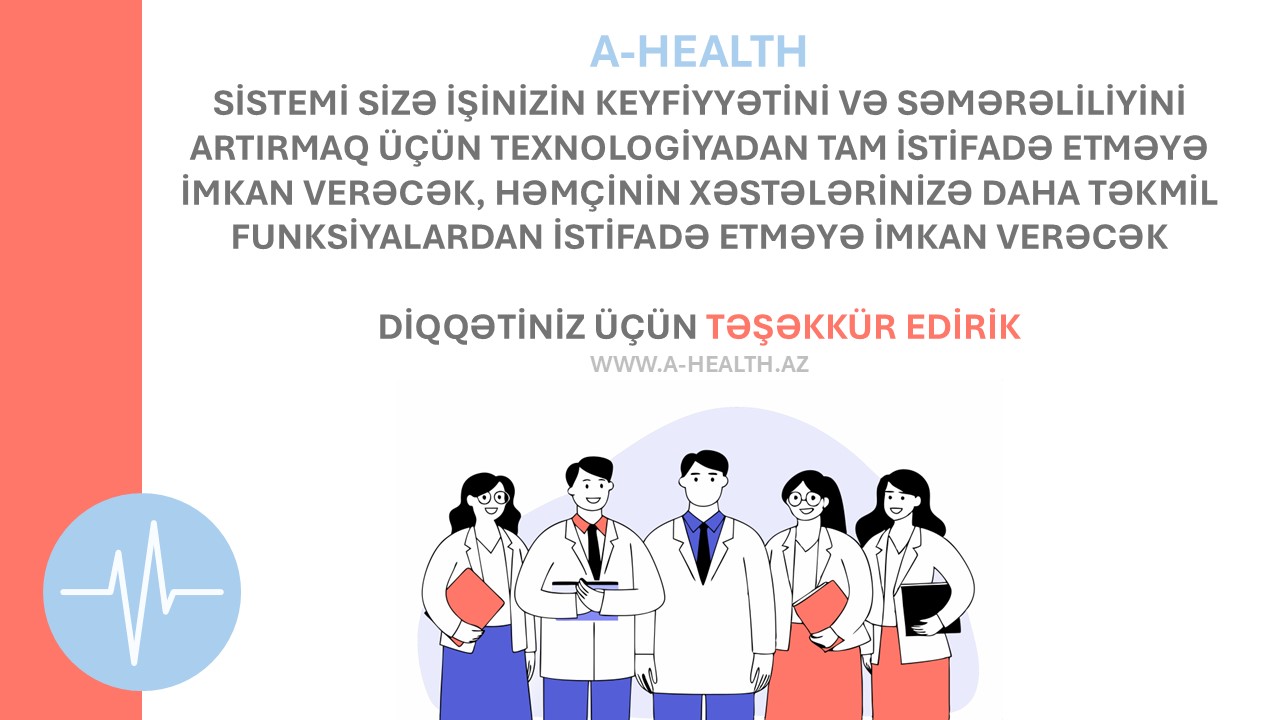 A–Health tətbiqi xəstəxana və klinikaların idarə edilməsi, xəstələrin qeydiyyatı və digər vacib funksiyalar üçün nəzərdə tutulub. Tətbiqimiz sizə vaxta qənaət edərək işinizi asanlaşdırır.